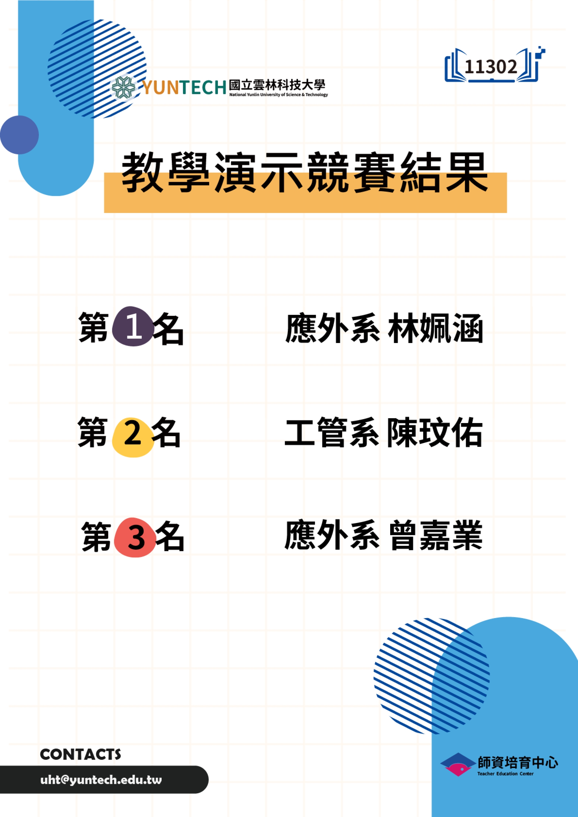 教學演示競賽結果公告。 獲獎名單如下: 第1名:應外系 林姵涵 第2名:工管系 陳玟佑 第3名:應外系 曾嘉業 教學演示競賽結果公告。 獲獎名單如下: 第1名:應外系 林姵涵 第2名:工管系 陳玟佑 第3名:應外系 曾嘉業